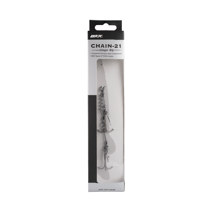 The AGL Chain-21 is a stinger rig engineered for pike fishing with large soft baits. Its elongated barrel swivels distribute torsional forces and allow freedom of movement, helping prevent fish from throwing hooks. A front screw and Z-shaped bait pins secure the rig to the lure, ensuring a consistent presentation cast after cast. Crafted from hardened stainless steel, it provides exceptional durability and reliability even during the toughest battles. A stealthy black nickel coating minimizes visibility underwater—an advantage on tough days or in heavily pressured waters.