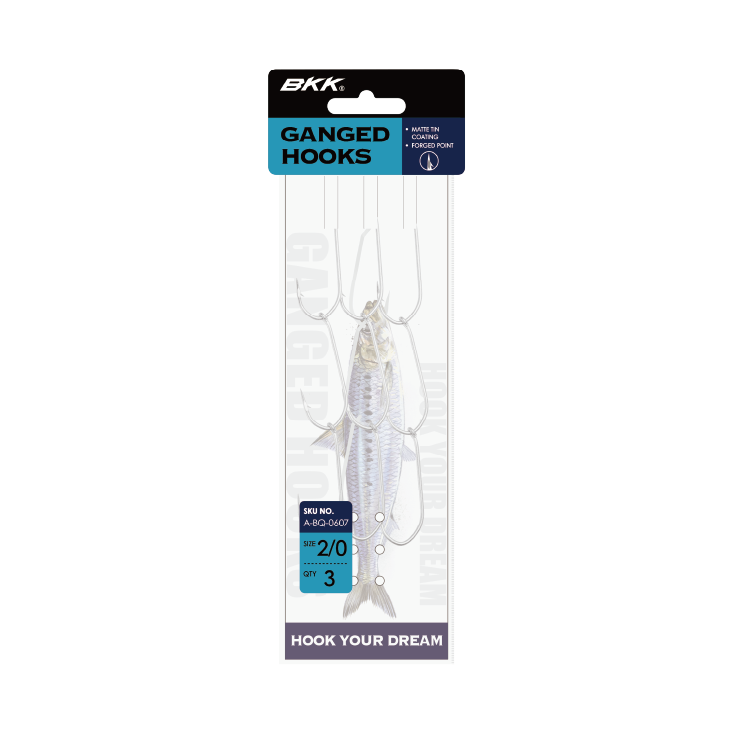 The AGL Ganged Hooks are designed for presenting strip baits or whole baits with maximum efficiency. Featuring multiple exposed hook points, they improve hook-up rates and help prevent bite-offs by keeping sharp teeth away from the main line. Each hook is finished in Matte Tin (MT) for corrosion resistance and equipped with an ultra-sharp needle point that ensures strong penetration and long-lasting sharpness. BKK’s forged-point technology allows the barb to protrude further, ensuring superior holding power and a secure hook-to-hook connection. For convenience, the pre-made versions come fully assembled and ready to tie directly to your line, offering anglers a quick and dependable rigging solution.