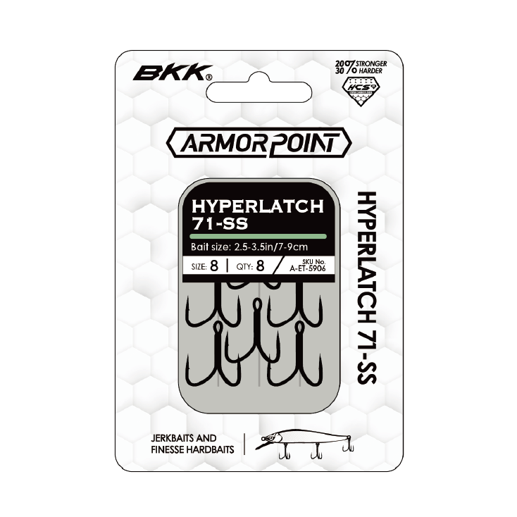 The AGL ARMORPOINT HYPER LATCH 71‑SS is a medium‑wire treble that blends the hooking efficiency of a round bend with the landing power of an O’Shaughnessy bend. Built from Hyper Carbon Steel (HCS) for greater strength and durability, it’s designed to handle trophy‑class fish. BKK’s Super Slide coating reduces penetration resistance for quicker, deeper hook sets with minimal pressure.