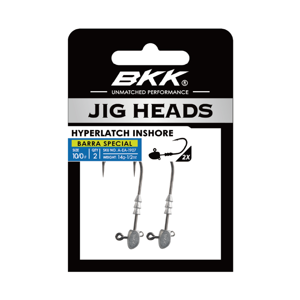 "The AGL Hyperlatch Inshore – Barra Special is a 2X-wire heavy-duty jighead developed to target powerful freshwater and saltwater inshore predators. Its wide-gap bend provides ample space for the hook point to remain exposed, allowing deeper penetration into the fish’s mouth. The bait keeper is designed to fit most kinds of soft plastic baits, including scented, floating, or sinking models with varying material blends. A unique feature is the stainless steel assist eyelet, which can be used to attach a treble hook or assist hooks for increased hook-up rates, or a blade for added flash and vibration. Built with Hyper Carbon Steel (HCS), it offers superior strength and durability compared to traditional high-carbon steel hooks, giving anglers the confidence to target trophy-sized fish. A Super Slide (SS) coating and ultra-sharp needle point ensure smooth penetration and optimized hook-up rates. For added