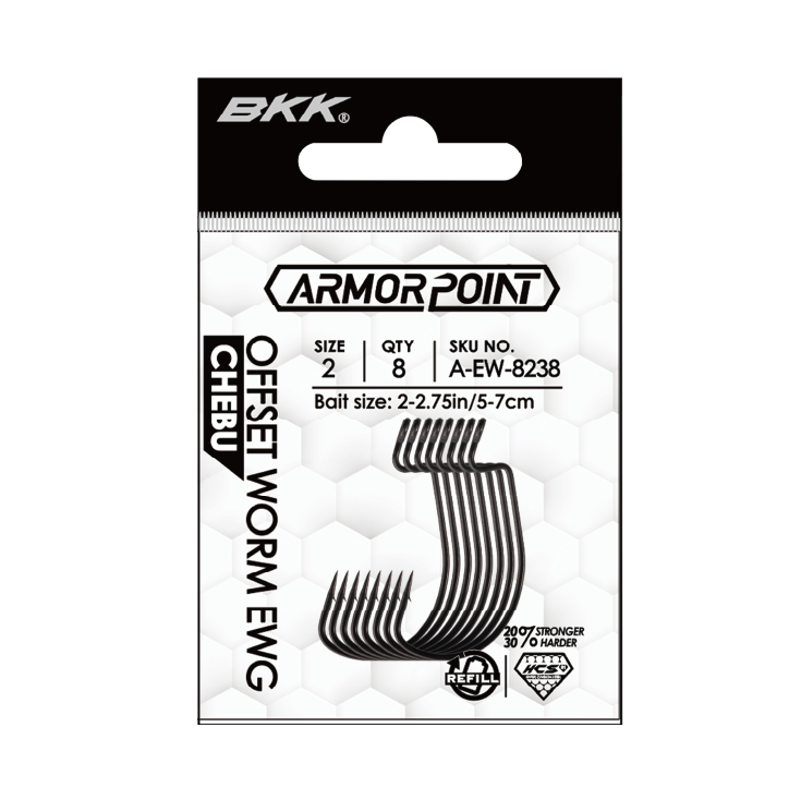 "The AGL Armorpoint Offset Worm EWG-Chebu is purpose-built for use with Cheburashka weights, featuring an oversized eye that allows the rigged bait to pivot freely for a natural and dynamic presentation. Its extra-wide gap bend accommodates bulkier soft plastics, ensuring the hook point is properly exposed when a fish strikes for dependable penetration. Built from Hyper Carbon Steel (HCS), the hook offers superior tensile strength compared to standard wire, making it dependable when fishing in heavy cover or fighting strong fish. The Super Slide (SS) finish ensures effortless penetration, while the needle-sharp point guarantees consistent hook-ups. Perfect for anglers who want the flexibility of Cheburashka rigging with the proven effectiveness of an EWG hook"