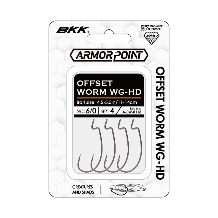 The AGL OFFSET WORM WG-HD is developed with an increased diameter tofish confidently in heavy cover and catch big bass. It features a wide gapthat can accommodate virtually any soft plastic with plenty of room for apositive hookset. This hook is equipped with a Super Slide (SS) finish and anextra-sharp needle point to ensure excellent penetration performance,heightening the overall hook-up rate. Made with Hyper Carbon Steel (HCS),the wire is stronger than other traditional High Carbon Steel wires. Theenhanced Z-bend makes for quick rigging and holds the plastics on thehook longer, reducing bait damage. Epoxy resin is also applied to seal thehook eye, ideal for fishing with braided lines.