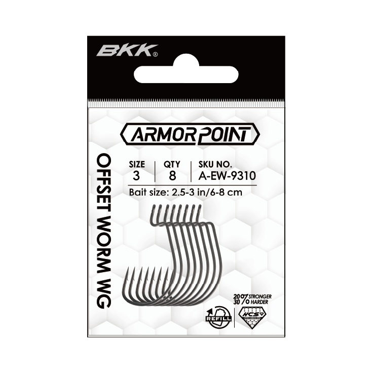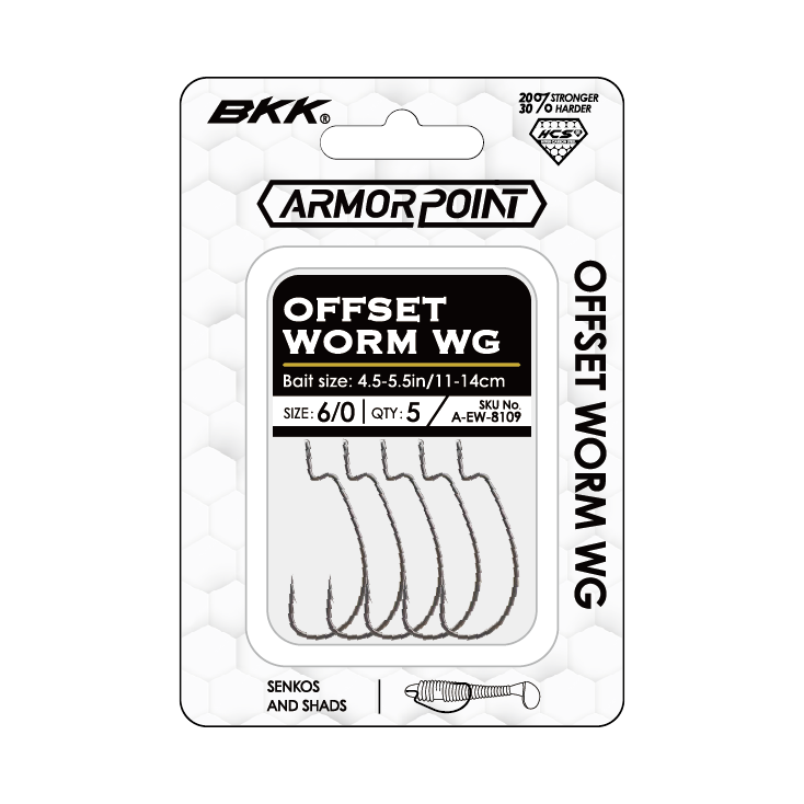 "The AGL OFFSET WORM WG is developed with a wide gap for Texas rigging senkos, shads, flukes, and creature-like soft baits. This hook is equipped with a Super Slide (SS) finish and an extra-sharp needle point to ensure excellent penetration performance, heightening the overall hook-up rate. Made with Hyper Carbon Steel (HCS), the wire is stronger than other traditional High Carbon Steel wires. The enhanced Z-bend makes for quick rigging and holds the plastics on the hook longer, reducing bait damage"