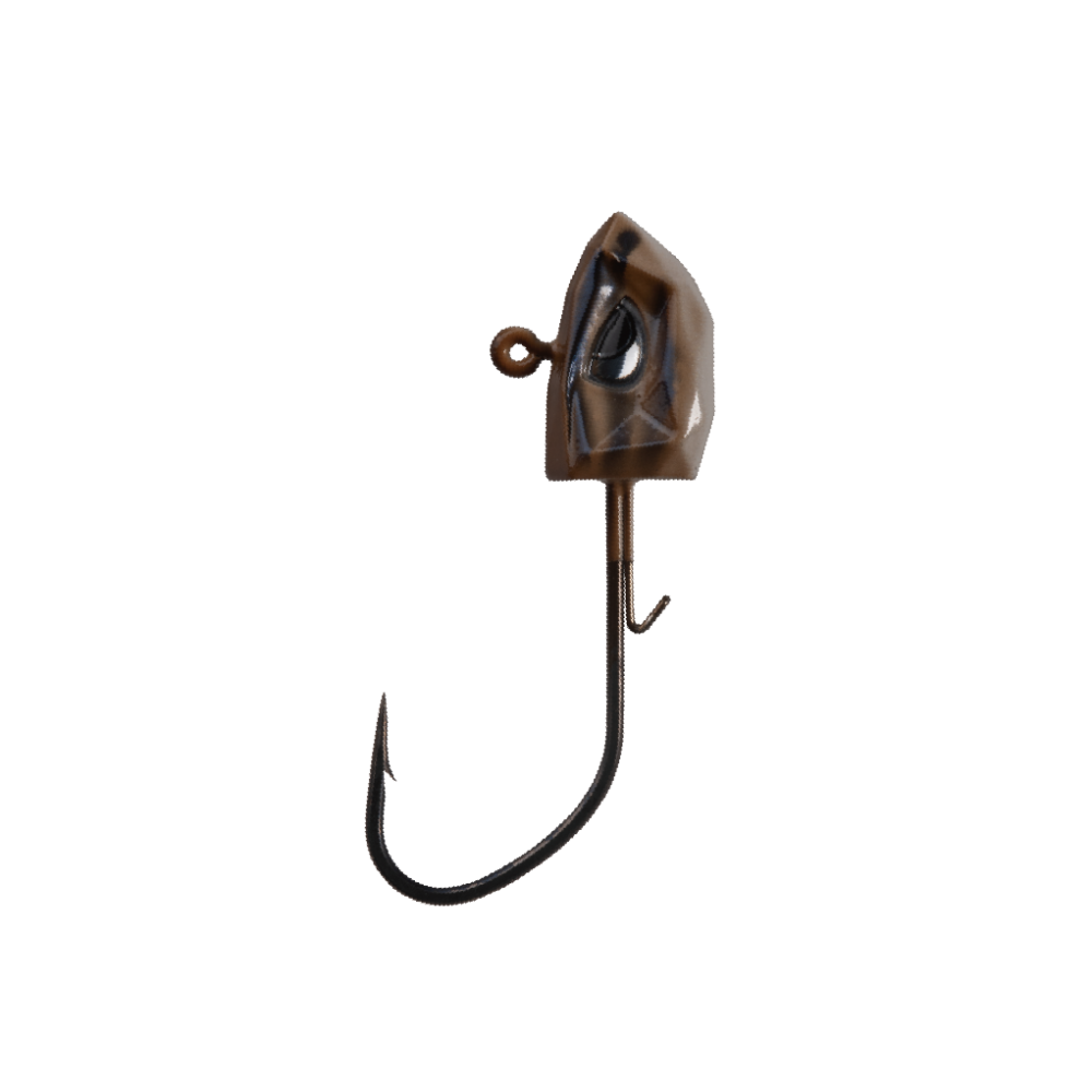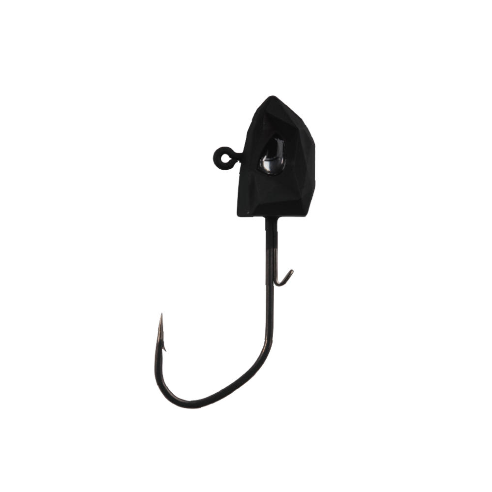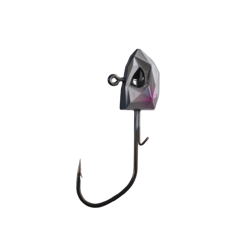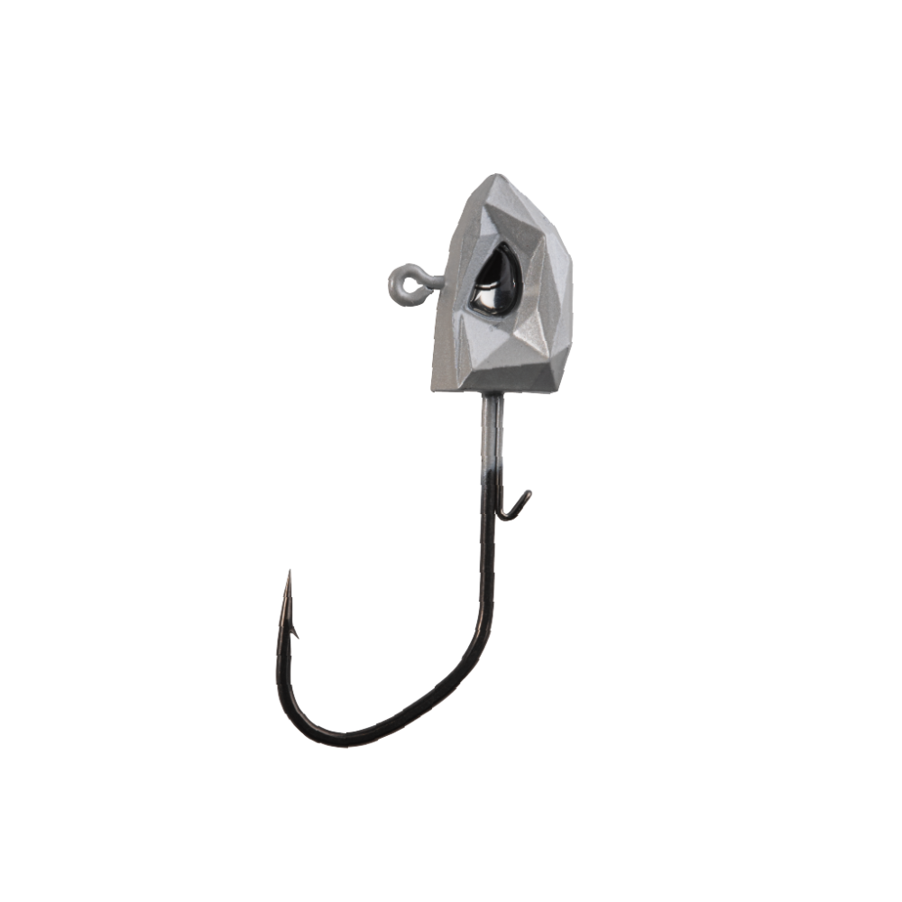 High‑performance jighead with multifaceted profile and lifelike 3D holographic eyes to mimic baitfish. Dual‑wire bait keeper secures soft plastics without tearing. Built on Hyper Carbon Steel with Super Slide coating and an extra‑sharp needle point for smooth penetration and reliable hooksets. Weight and hook size stamped on the belly.